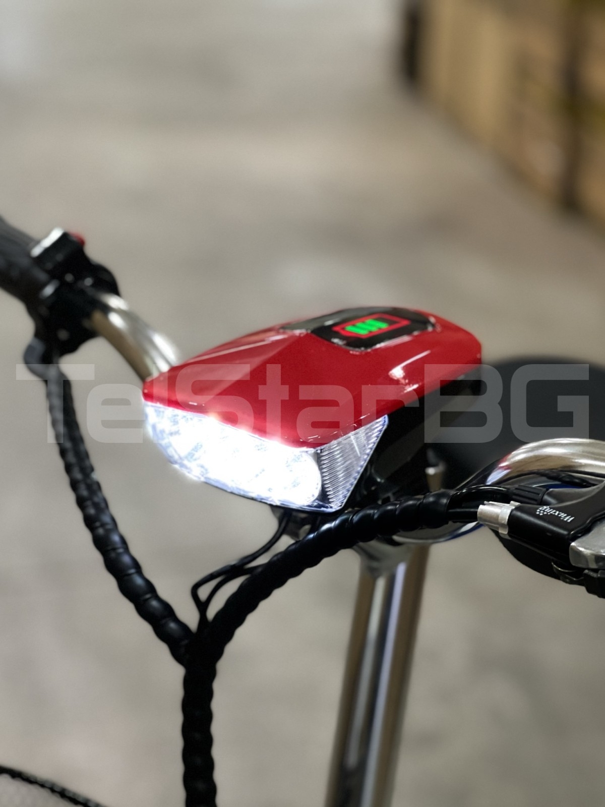 регулируемо кормило - три предни + 1 задна скорост - зарежда се от мрежата: 220V (зарядното е включено в комплекта) преден LED фар с индикатор за нивото на батерията + дисплей с показание ниявото на батерията ръчна спирачка
