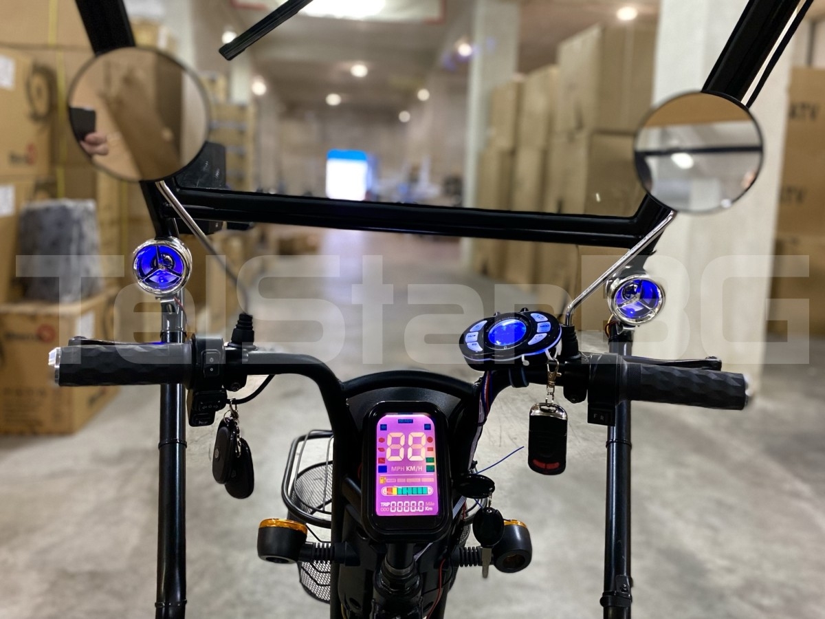| Допълнителна информация | задно предаване, с диференциал - брой места: 3 - местна ,спирачна система: 1 крачна и 3 ръчни спирачки за по-удобно спиране - 3 скорости + задна скорост - аварийни светлини - ГОЛЯМ дигитален LCD дисплей - странични светлоотразители - пълна светлинна окомплектовка ( преден LED фар тип ЛУПА , мигачи- предни, задни, стопове, габарити) - задната седалка се преобръща и се превръща в голямо карго отделение - клаксон - метална кошница за багаж отпред - Подарък- 2 бр. огледала за задно виждане + 2бр. дистанционни с аларма и безконтактно включване + предна пазарска кошница за пазаруване + ГОЛЯМА задна пазарска кошница за пазаруване |